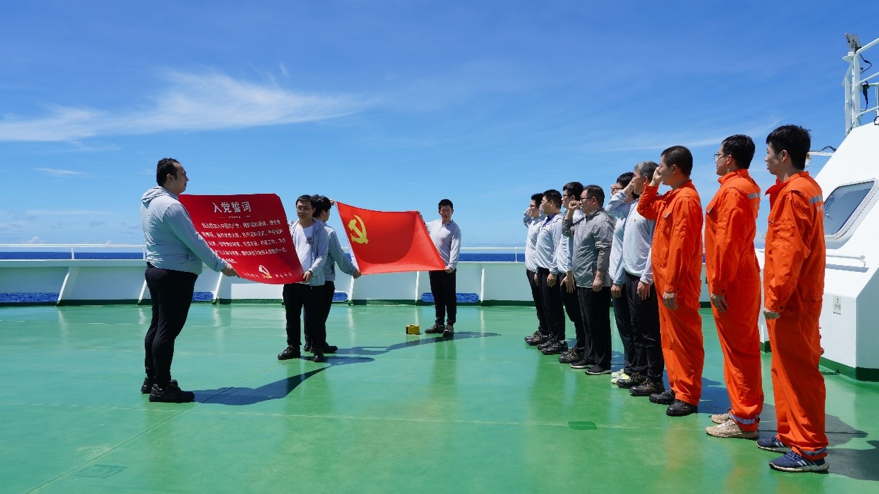 上午10時(shí)50分,《義勇軍進(jìn)行曲》莊嚴(yán)奏響,升旗儀式正式開始。海上工作組全體成員齊唱國歌,肅立注目五星紅旗冉冉升起。隨后,中西印度洋公海漁業(yè)資源調(diào)查臨時(shí)黨支部全體成員集結(jié)于黨旗前,肅穆重溫入黨誓詞,鄭重表達(dá)對黨的堅(jiān)定信仰和對祖國科研事業(yè)的責(zé)任擔(dān)當(dāng)。