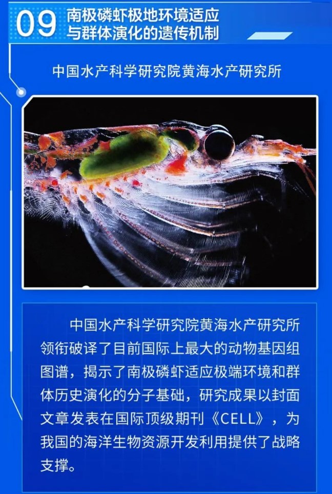 黃海水產(chǎn)研究所邵長偉領(lǐng)銜的國際團隊利用我國科學(xué)家自主研發(fā)的基因組組裝算法,突破了超大且高重復(fù)基因組組裝技術(shù)瓶頸,繪制了迄今為止最大的動物基因組圖譜(基因組大小為48Gb,約是人類基因組的16倍,重復(fù)序列高達92.45%);首次揭示了南極磷蝦適應(yīng)極晝極夜生物節(jié)律的分子機制;證實了環(huán)南極不同群體間的遺傳連通性,發(fā)現(xiàn)了環(huán)境對種群結(jié)構(gòu)的潛在影響,解析了南極磷蝦種群擴張的演變規(guī)律。上述科學(xué)發(fā)現(xiàn)為海洋生物極端環(huán)境適應(yīng)機制及群體演化研究提供了新的理論參考,為極地漁業(yè)資源的管理提供了理論依據(jù)。