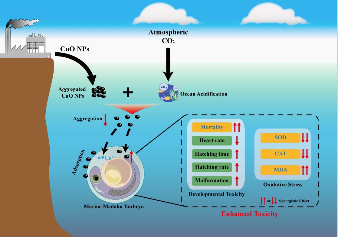新污染物和氣候變化是全球關(guān)注的重大環(huán)境問題。黃海水產(chǎn)研究所黃渤海漁業(yè)生態(tài)環(huán)境評價與生物修復(fù)創(chuàng)新團(tuán)隊以典型新污染物納塑料和金屬納米顆粒為研究材料,以模式生物小球藻和海水青鳉為研究對象,開展了海洋酸化耦合納米CuO顆粒/聚苯乙烯納塑料、UV-B輻射耦合納米TiO2顆粒的生物毒性效應(yīng)研究,系統(tǒng)闡明了氣候變化耦合典型新污染物的海洋環(huán)境效應(yīng)。