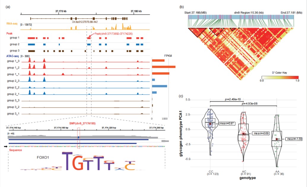黃海水產(chǎn)研究所海水貝類種質(zhì)創(chuàng)制與利用創(chuàng)新團(tuán)隊在構(gòu)建近江牡蠣基因組精細(xì)圖譜的基礎(chǔ)上,聯(lián)合全基因組關(guān)聯(lián)分析(GWAS)、轉(zhuǎn)錄組測序(RNA-seq)分析和染色質(zhì)可及性測序(ATAC-seq)分析等多種技術(shù)方法,篩查定位到63個與糖原代謝相關(guān)的候選基因;轉(zhuǎn)錄組與代謝組聯(lián)合分析查明高糖原組性腺組織中糖原分解、糖酵解和三羧酸循環(huán)(TCA)過程高度活躍,而與糖異生相關(guān)基因PEPCK和FBP1在低糖原組高表達(dá);原位雜交、qRT-PCR技術(shù)明確了GS、GS3β基因在近江牡蠣外套膜、鰓、閉殼肌、肝胰腺、唇瓣、性腺等組織的時空表達(dá)規(guī)律,并通過RNA干擾等技術(shù)證明了近江牡蠣閉殼肌和肝胰腺中GS3β基因?qū)S表達(dá)的調(diào)控作用。以上研究為進(jìn)一步解析近江牡蠣糖原代謝機制奠定了基礎(chǔ),同時為培育高品質(zhì)牡蠣新品種提供了科學(xué)依據(jù)和技術(shù)支撐。相關(guān)成果發(fā)表在國際知名期刊Zoological Research和Fishes。