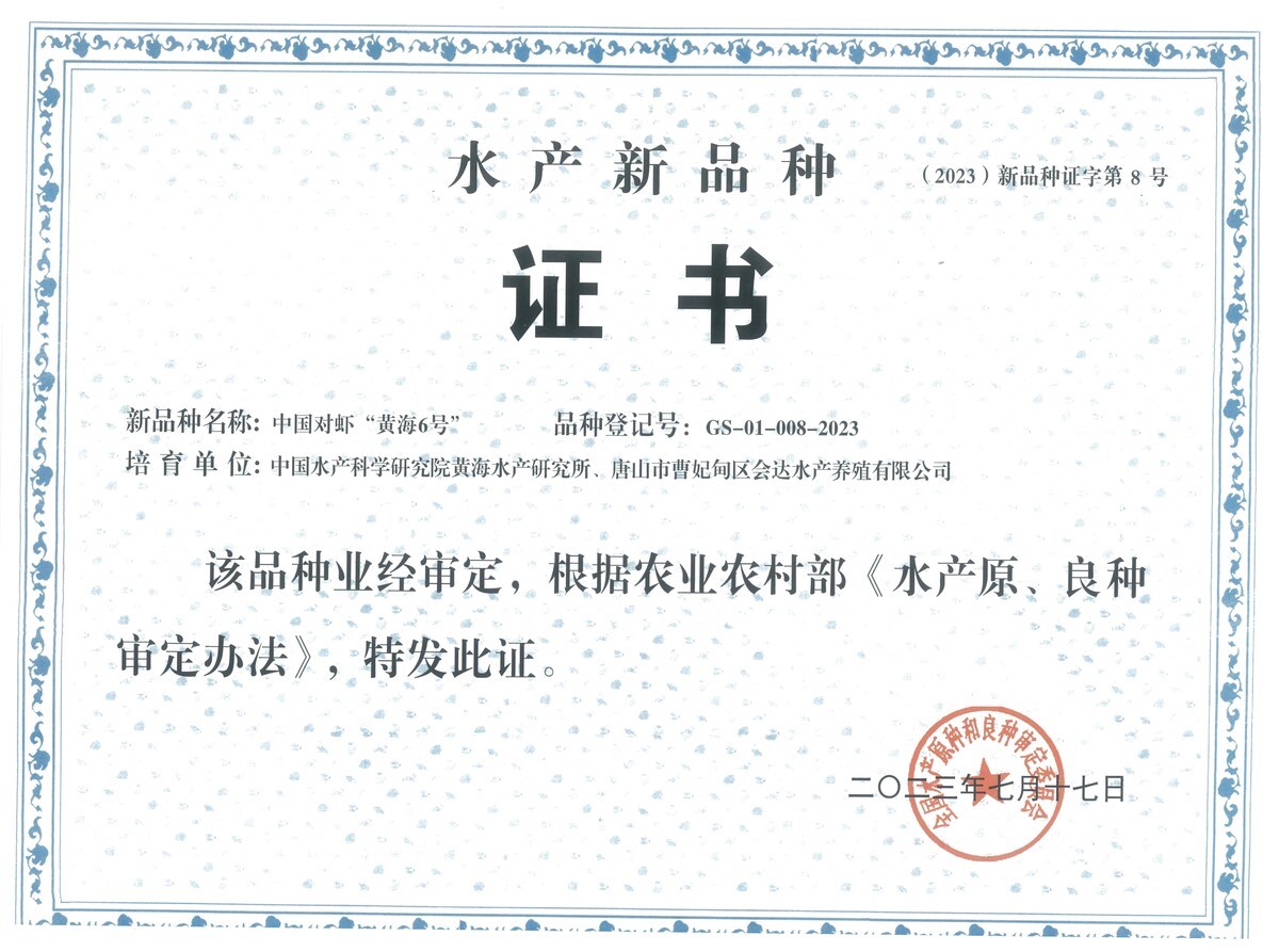 黃海水產(chǎn)研究所凡納濱對蝦和中國對蝦遺傳育種創(chuàng)新團(tuán)隊針對中國對蝦養(yǎng)殖業(yè)的困境,立足于中國對蝦產(chǎn)業(yè)提升和綠色發(fā)展,聚焦中國對蝦低溫耐受性、WSSV抗性、存活率和收獲體重等主要選育性狀,基于多性狀復(fù)合育種技術(shù)進(jìn)行中國對蝦新品種選育,于2023年成功獲批國審新品種“黃海6號”(水產(chǎn)新品種登記號:GS-01-008-2023),實現(xiàn)早放苗、晚收獲(錯峰),延長養(yǎng)殖時間,達(dá)到增產(chǎn)增收效果。