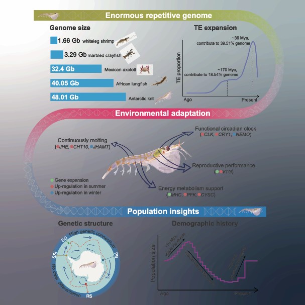 黃海水產(chǎn)研究所海洋漁業(yè)生物遺傳資源評價與合成利用創(chuàng)新團(tuán)隊領(lǐng)銜破譯了國際上迄今為止最大的動物基因組圖譜-南極磷蝦基因組圖譜,揭示了南極磷蝦適應(yīng)極端環(huán)境和群體歷史演化的分子基礎(chǔ),研究成果以封面文章形式發(fā)表在Cell,是我國水產(chǎn)領(lǐng)域首篇Cell論文。該成果利用我國自主研發(fā)的基因組組裝算法,突破了超大且高重復(fù)基因組組裝的技術(shù)瓶頸,繪制了迄今為止最大的動物基因組圖譜(基因組大小為48Gb,約是人類基因組的16倍,重復(fù)序列高達(dá)92.45%);首次揭示了南極磷蝦適應(yīng)極晝極夜生物節(jié)律的分子機制;證實了環(huán)南極大陸不同群體間具有遺傳連通性,發(fā)現(xiàn)了環(huán)境對種群結(jié)構(gòu)的潛在影響,闡明了南極磷蝦資源量形成與積聚的歷史演變規(guī)律。研究成果為海洋生物極端環(huán)境適應(yīng)機制及群體演化研究提供了新的理論參考,為極地漁業(yè)資源的管理提供了科學(xué)依據(jù)。