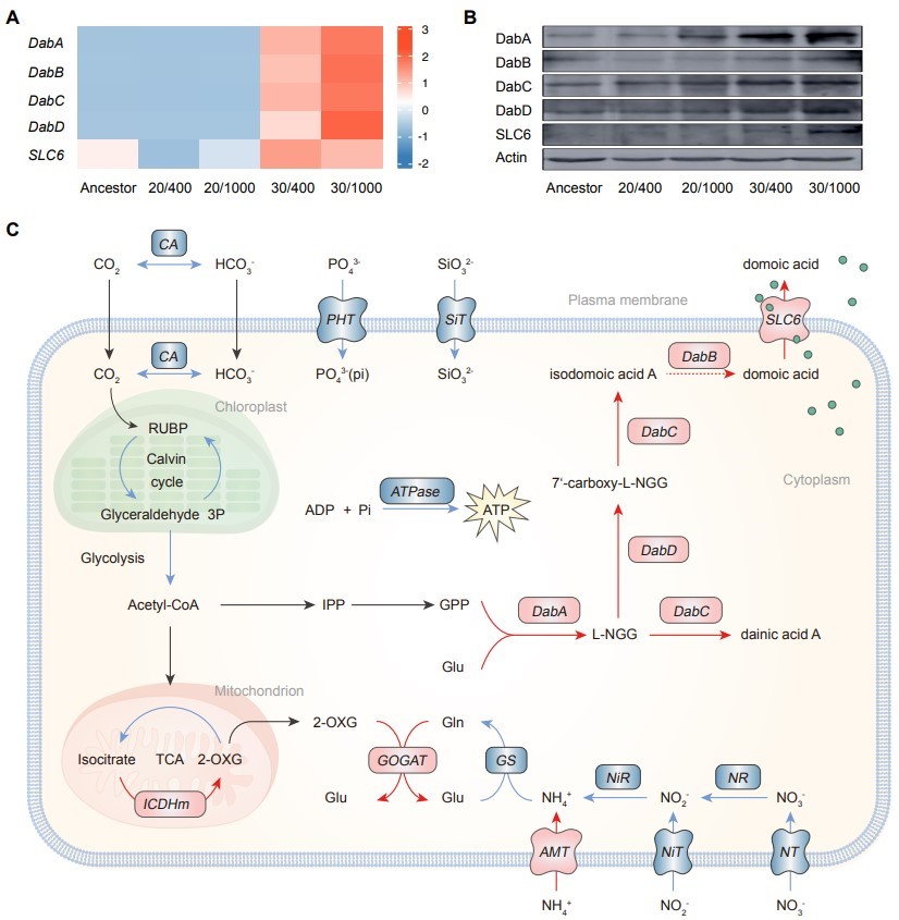 黃海水產(chǎn)研究所海洋藻類種質(zhì)創(chuàng)制與利用創(chuàng)新團(tuán)隊以全球變暖和海洋酸化為背景,采用多學(xué)科交叉技術(shù)手段,通過短期應(yīng)激和長期適應(yīng)性實驗、實驗室模擬和海區(qū)現(xiàn)場實驗等不同時空試驗的對比驗證,深入解析了多列擬菱形藻對海洋升溫和酸化的生物學(xué)應(yīng)答與調(diào)控機制。結(jié)果顯示,海洋升溫和酸化顯著增加多列擬菱形藻軟骨藻酸代謝水平,在長期適應(yīng)條件下,多列擬菱形藻對溫度和酸化具有較強的表型可塑性;升溫和酸化顯著提高軟骨藻酸代謝核心基因DabA、DabB、DabC、DabD和SLC6表達(dá),從而增加了細(xì)胞內(nèi)外軟骨藻酸的濃度。研究為全面解析赤潮硅藻毒素代謝機制奠定基礎(chǔ),為闡明氣候變化下赤潮毒素產(chǎn)生機理及響應(yīng)模式提供基礎(chǔ)數(shù)據(jù),同時為赤潮生物毒素的生態(tài)風(fēng)險評估提供理論與技術(shù)支持。以上工作發(fā)表于國際知名期刊The ISME Journal。
