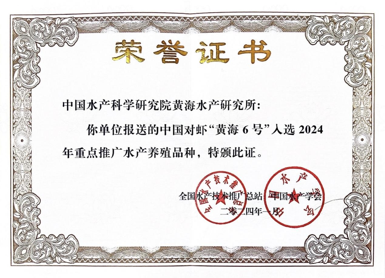 黃海水產(chǎn)研究所孔杰研究員團隊與唐山市曹妃甸區(qū)會達水產(chǎn)養(yǎng)殖有限公司聯(lián)合培育的中國對蝦“黃海6號”,具有生長速度快,養(yǎng)殖成活率高,可實現(xiàn)提早放苗、錯峰收獲、延長養(yǎng)殖時間、保產(chǎn)和增產(chǎn)能力強等特點?!包S海6號”與未經(jīng)選育的中國對蝦相比,低溫半致死存活率、WSSV感染后半致死存活率和210日齡體重分別提高32.22%、27.74%和41.27%。“黃海6號”適宜在我國對蝦主產(chǎn)區(qū)水溫15℃~30℃和鹽度20~33‰人工可控海水水體中養(yǎng)殖。通過重點示范推廣,“黃海6號”已在河北省曹妃甸區(qū)、遼寧省丹東市等地產(chǎn)生了良好的經(jīng)濟、社會和生態(tài)效益,助推中國對蝦養(yǎng)殖產(chǎn)業(yè)綠色健康可持續(xù)發(fā)展。