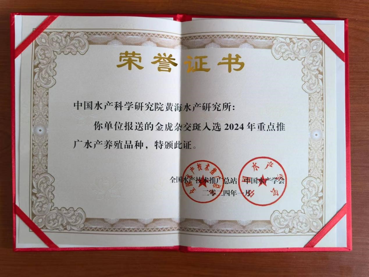 黃海水產(chǎn)研究所田永勝研究員團隊與萊州明波水產(chǎn)有限公司、海南晨海水產(chǎn)有限公司和中山大學等單位聯(lián)合培育的石斑魚新品種“金虎雜交斑”,具有生長快、耐溫廣、耐低氧、耐低鹽和營養(yǎng)豐富等優(yōu)良性狀。1-2齡金虎雜交斑體重較母本(棕點石斑魚)提高74.4%-100.2%,較同類養(yǎng)殖種珍珠龍膽提高48.8%-60.7%;停食溫度16℃,較母本降低3℃;耐低氧可達0.24mg/L,鹽度適應范圍8-35‰,肌肉中粗蛋白(20.2%)、必需氨基酸(7.7%)和總氨基酸(18.53%)含量均高于母本和普遍養(yǎng)殖種。“金虎雜交斑”可以在我國海水工廠化、池塘、網(wǎng)箱及西部半堿水環(huán)境中普遍養(yǎng)殖,其培育成功和廣泛推廣,為我國漁業(yè)現(xiàn)代化養(yǎng)殖提供了高效、優(yōu)質(zhì)的石斑魚品種,將有力推動漁業(yè)種業(yè)創(chuàng)新和產(chǎn)業(yè)發(fā)展。