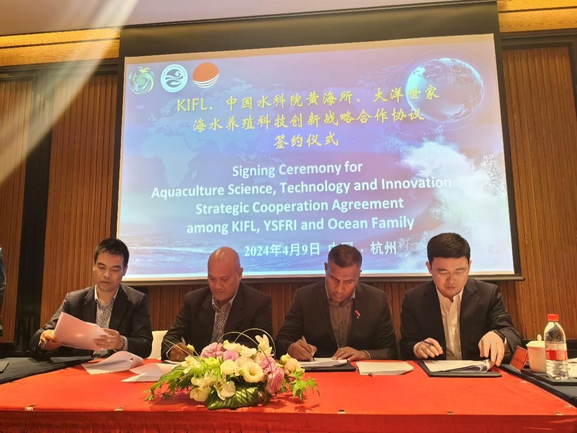 座談會(huì)后,為進(jìn)一步推動(dòng)中國(guó)與基里巴斯?jié)O業(yè)務(wù)實(shí)合作,落實(shí)《中華人民共和國(guó)農(nóng)業(yè)農(nóng)村部與基里巴斯共和國(guó)漁業(yè)和海洋資源發(fā)展部關(guān)于漁業(yè)合作的諒解備忘錄》,黃海水產(chǎn)研究所與大洋世家(浙江)股份公司、基里巴斯圣誕島漁業(yè)有限公司簽署《海水養(yǎng)殖科技創(chuàng)新戰(zhàn)略合作協(xié)議》。