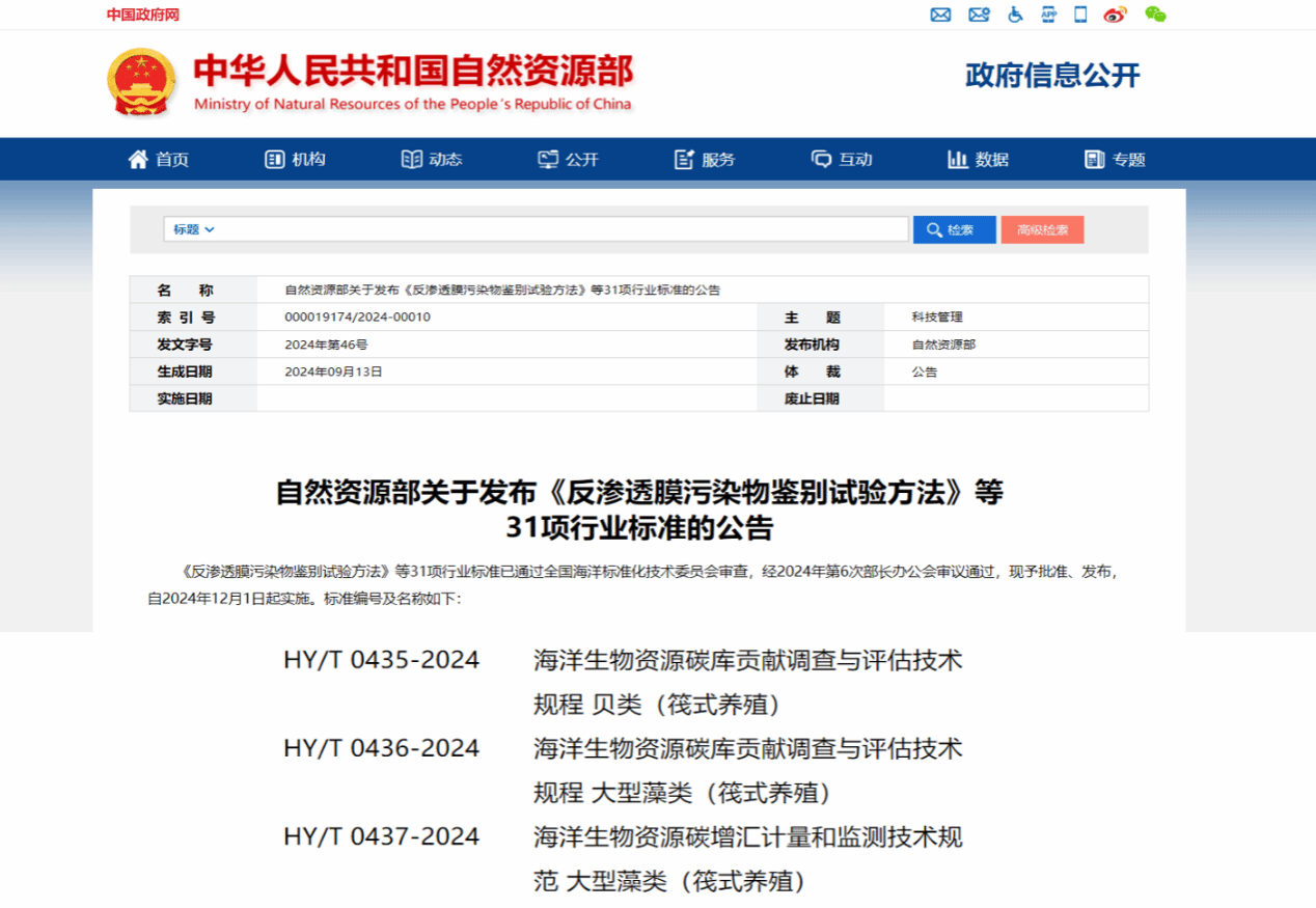 9月13日,自然資源部正式發(fā)布了《反滲透膜污染物鑒別試驗方法》等31項行業(yè)標準(〔2024〕46號)。由中國水產(chǎn)科學(xué)研究院黃海水產(chǎn)研究所張繼紅研究員牽頭、吳文廣助理研究員和劉毅工程師等骨干成員參與完成的《海洋生物資源碳庫貢獻調(diào)查與評估技術(shù)規(guī)程 貝類(筏式養(yǎng)殖)》(HY/T 0435-2024)、《海洋生物資源碳庫貢獻調(diào)查與評估技術(shù)規(guī)程 大型藻類(筏式養(yǎng)殖)》(HY/T 0436-2024)、《海洋生物資源碳增匯計量和監(jiān)測技術(shù)規(guī)范 大型藻類(筏式養(yǎng)殖)》(HY/T 0437-2024)國家海洋行業(yè)標準正式獲批發(fā)布。這是黃海所自2021年發(fā)布國內(nèi)首個漁業(yè)碳匯領(lǐng)域標準《養(yǎng)殖大型藻類和雙殼貝類碳匯計量方法 碳儲量變化法》(HY/T 0305-2021)以來,再次獲批的相關(guān)海洋行業(yè)標準,為構(gòu)建我國漁業(yè)碳匯計量評估標準體系提供了方法學(xué)支撐。