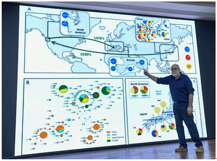 John Humphreys教授做了題為“The Manila Clam, Ruditapes philippinarum: Worldwide and in Britain”的學(xué)術(shù)報(bào)告,主要介紹了世界各地菲律賓蛤仔的地理分布、育種和養(yǎng)殖現(xiàn)狀,以及蛤仔種質(zhì)資源受到環(huán)境因素和鳥類捕食等方面影響的最新研究進(jìn)展,引起了參會(huì)人員的廣泛興趣。John Humphreys教授還與參會(huì)人員就菲律賓蛤仔世界分布、殼色選育等問(wèn)題展開了深入探討和交流,現(xiàn)場(chǎng)氣氛熱烈。會(huì)后,John Humphreys教授還參觀了黃海所種質(zhì)資源與工程育種研究室。