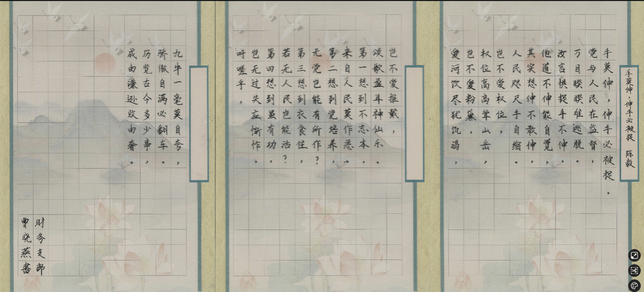 本次活動得到了黃海所廣大書畫愛好者的熱烈響應(yīng)和積極參與,創(chuàng)作出多幅優(yōu)秀書畫作品,以獨特的藝術(shù)視角和表現(xiàn)形式,詮釋了廉潔的內(nèi)涵和意義,表達(dá)了對黨、對祖國的熱愛以及永遠(yuǎn)跟黨走的堅定決心。