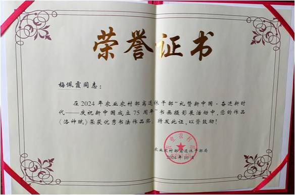 日前,農(nóng)業(yè)農(nóng)村部離退休干部局舉辦“禮贊新中國(guó)·奮進(jìn)新時(shí)代”慶祝中華人民共和國(guó)成立75周年書(shū)畫(huà)攝影展,中國(guó)水產(chǎn)科學(xué)研究院黃海水產(chǎn)研究所退休干部梅佩霞提交的《洛神賦》、李希平提交的《千字文》榮獲優(yōu)秀書(shū)法作品獎(jiǎng)。
