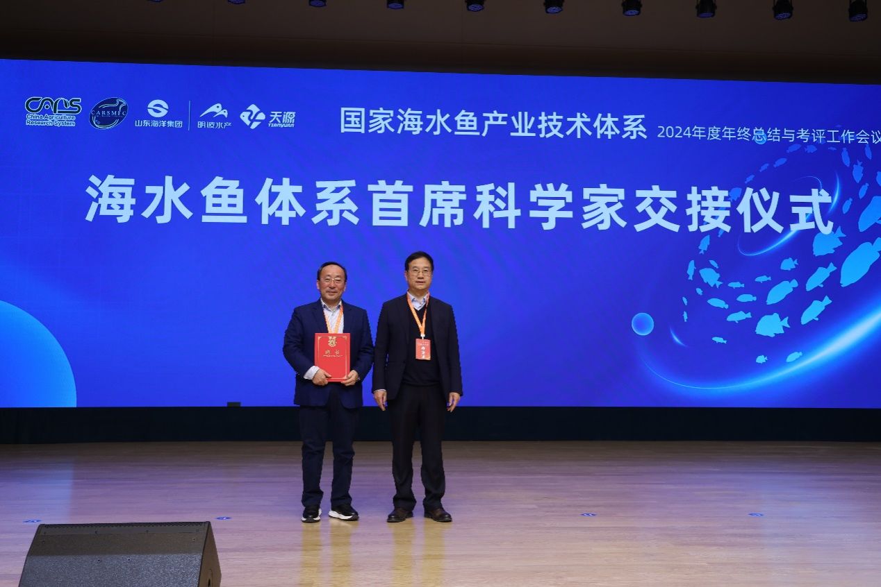 農(nóng)業(yè)農(nóng)村部漁業(yè)漁政管理局高度重視海水魚體系建設(shè),王欣太副局長親自到會指導(dǎo),肯定了海水魚體系2024年的工作成績;科技與市場加工處處長曾昊主持了對首席科學(xué)家的考評及新老首席交接工作。首席科學(xué)家關(guān)長濤研究員作海水魚體系2024年度述職匯報,接受了海水魚體系全體人員的評議及民主測評。會議宣布,自2025年起,海水魚體系首席科學(xué)家將由中國工程院院士、黃海所陳松林研究員擔(dān)任。王英凡宣讀了《農(nóng)業(yè)農(nóng)村部關(guān)于印發(fā)現(xiàn)代農(nóng)業(yè)產(chǎn)業(yè)技術(shù)體系增補(bǔ)聘用人員名單的通知》,在全體與會人員的見證下,海水魚體系新老首席科學(xué)家完成交接。陳松林院士代表新一屆海水魚體系集體表態(tài)發(fā)言,肯定了關(guān)長濤首席為海水魚體系建設(shè)和產(chǎn)業(yè)發(fā)展所作的突出貢獻(xiàn),提出了未來海水魚體系的工作重點(diǎn)。