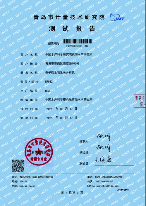 近日,中國水產(chǎn)科學研究院黃海水產(chǎn)研究所張旭志研究員牽頭研發(fā)的電子微生物生長分析儀通過了青島市計量技術(shù)研究院的計量與性能檢定。