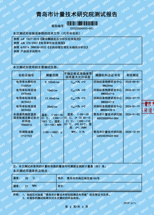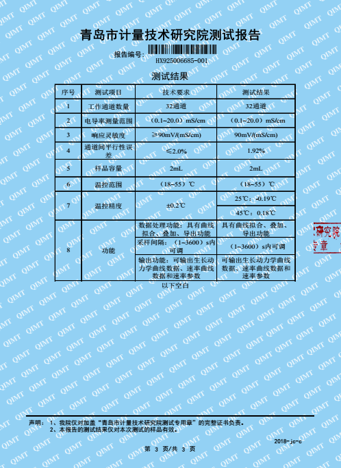 具有CNAS和CMA資質(zhì)的青島市計量技術(shù)研究院對儀器的性能和參數(shù)按照國家標準進行了檢定,測試項目包括性能和功能指標,并出具了測試報告,出具的數(shù)據(jù)可以溯源至國家計量基準。檢測結(jié)果表明,電子微生物生長分析儀具有32個工作通道、電導(dǎo)率測量范圍為0.1-20.0 mS/cm、響應(yīng)靈敏度為90 mV/( mS/cm)、通道間平行性誤差為1.92%、樣品容量為2mL、溫控范圍為18-55℃、溫控精度為≤±0.2℃;專用軟件具有曲線擬合、疊加和導(dǎo)出功能,采樣間隔(及曲線時間分辨率)在1—3600s之間可調(diào),可自動輸出生長動力學曲線、速率曲線數(shù)據(jù)和速率參數(shù)。