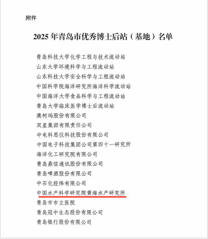 近日,青島市人力資源和社會(huì)保障局公布了2025年青島市優(yōu)秀博士后站(基地)名單,中國水產(chǎn)科學(xué)研究院黃海水產(chǎn)研究所名列其中,這是黃海所繼2023年后再次獲得該項(xiàng)表彰。據(jù)悉,2025年青島市優(yōu)秀博士后站(基地)共評(píng)選31家。