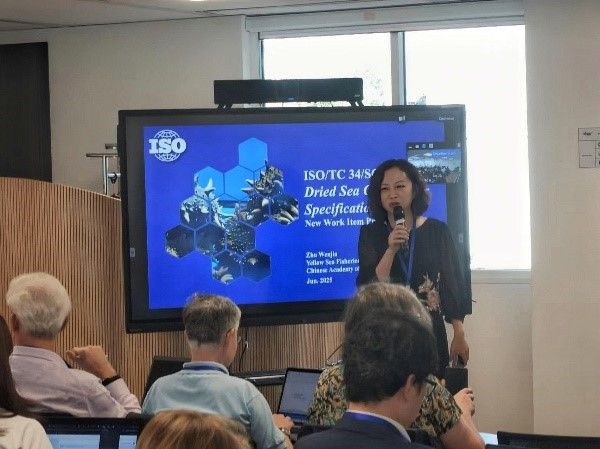 朱文嘉副研究員作了《干海參制品》國(guó)際標(biāo)準(zhǔn)新工作項(xiàng)目提案專題報(bào)告,詳細(xì)介紹了立項(xiàng)背景、必要性、技術(shù)要求、預(yù)期目標(biāo)及工作計(jì)劃,展示了我國(guó)在該領(lǐng)域扎實(shí)的科研基礎(chǔ)和技術(shù)實(shí)力,該提案獲得了與會(huì)代表的高度評(píng)價(jià)和一致認(rèn)可。干海參作為我國(guó)傳統(tǒng)的優(yōu)勢(shì)海產(chǎn)品,國(guó)際標(biāo)準(zhǔn)的研制將有效提升產(chǎn)品質(zhì)量和安全水平,促進(jìn)全球海參產(chǎn)品貿(mào)易及水產(chǎn)加工業(yè)高質(zhì)量發(fā)展。根據(jù)會(huì)議決議,ISO/TC34/SC6秘書(shū)處將啟動(dòng)分技術(shù)委員會(huì)職權(quán)范圍的優(yōu)化調(diào)整與《干海參制品》國(guó)際標(biāo)準(zhǔn)的新項(xiàng)目提案的投票程序,若投票順利通過(guò),將進(jìn)一步推動(dòng)我國(guó)水產(chǎn)領(lǐng)域國(guó)際標(biāo)準(zhǔn)化能力提升,將我國(guó)的產(chǎn)業(yè)優(yōu)勢(shì)轉(zhuǎn)化為標(biāo)準(zhǔn)優(yōu)勢(shì),顯著增強(qiáng)我國(guó)在水產(chǎn)品加工領(lǐng)域的國(guó)際話語(yǔ)權(quán)和市場(chǎng)競(jìng)爭(zhēng)力。