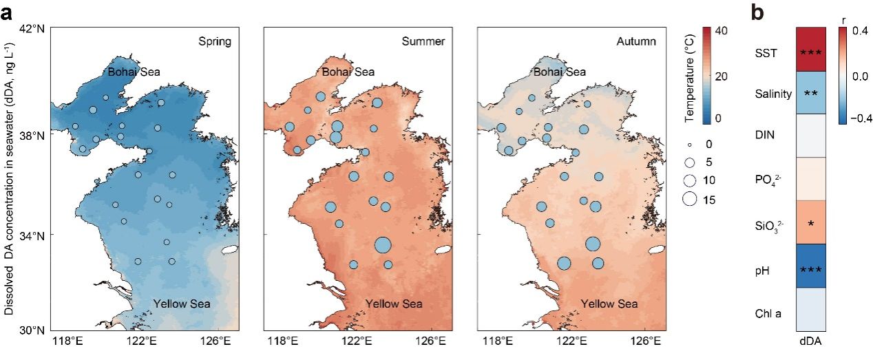研究進(jìn)一步分析了影響其分布與產(chǎn)毒的關(guān)鍵因子,發(fā)現(xiàn)海表溫度(SST)是最主要的環(huán)境驅(qū)動(dòng)因子。渤黃海近海調(diào)查顯示,溶解態(tài)DA占比超過(guò)99.5%,并呈明顯季節(jié)性變化,夏季濃度最高。團(tuán)隊(duì)還對(duì)黃海分離的P. multiseries開(kāi)展了長(zhǎng)達(dá) 800天的室內(nèi)多溫度梯度實(shí)驗(yàn),結(jié)果表明其生長(zhǎng)速率在20℃條件下最高,而毒素生產(chǎn)效率在30℃時(shí)達(dá)到峰值,為建立溫度與毒素生產(chǎn)的生物統(tǒng)計(jì)模型奠定了基礎(chǔ)。