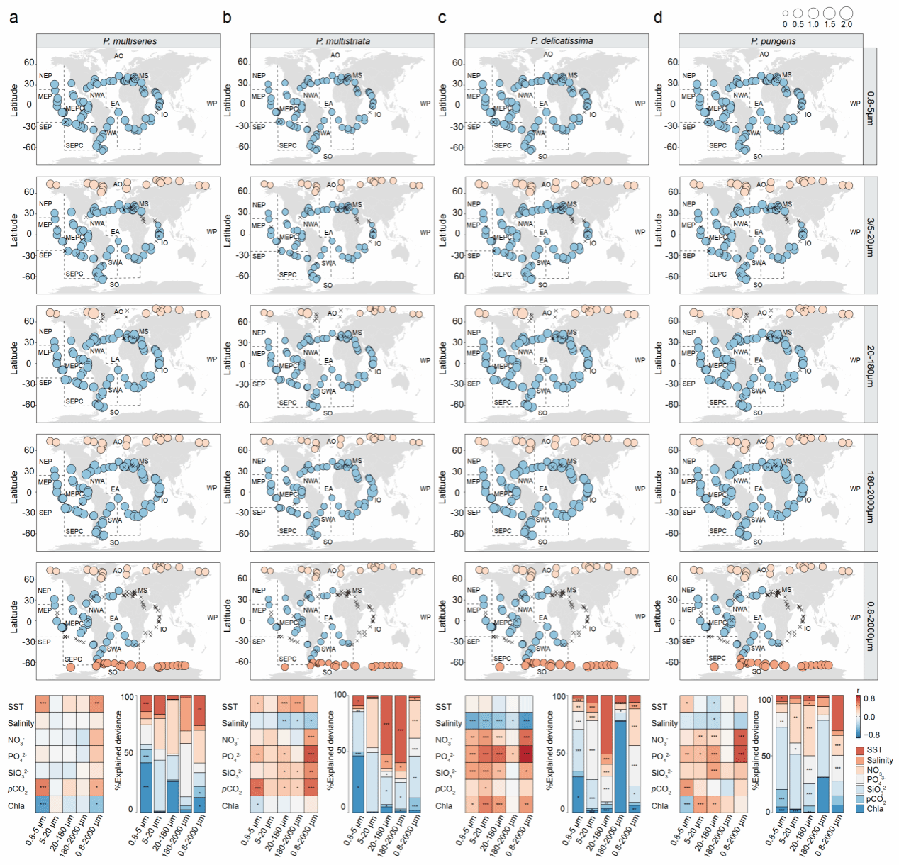 研究完成了中國(guó)近海與環(huán)南大洋的資源調(diào)查,整合Tara Oceans全球多組學(xué)數(shù)據(jù),聚焦于四個(gè)最具毒性的擬菱形藻種:P. multiseries、P. multistriata、P. delicatissima和P. pungens。結(jié)果顯示,四種有毒硅藻不僅存在于傳統(tǒng)沿海高風(fēng)險(xiǎn)區(qū),更廣泛分布于極地、熱帶及其他開(kāi)闊洋區(qū),突破了以往“毒素型擬菱形藻局限于近岸赤潮區(qū)”的傳統(tǒng)認(rèn)知。其中,P. multiseries在多個(gè)區(qū)域相對(duì)豐度最高,展現(xiàn)出極強(qiáng)的生態(tài)適應(yīng)性。