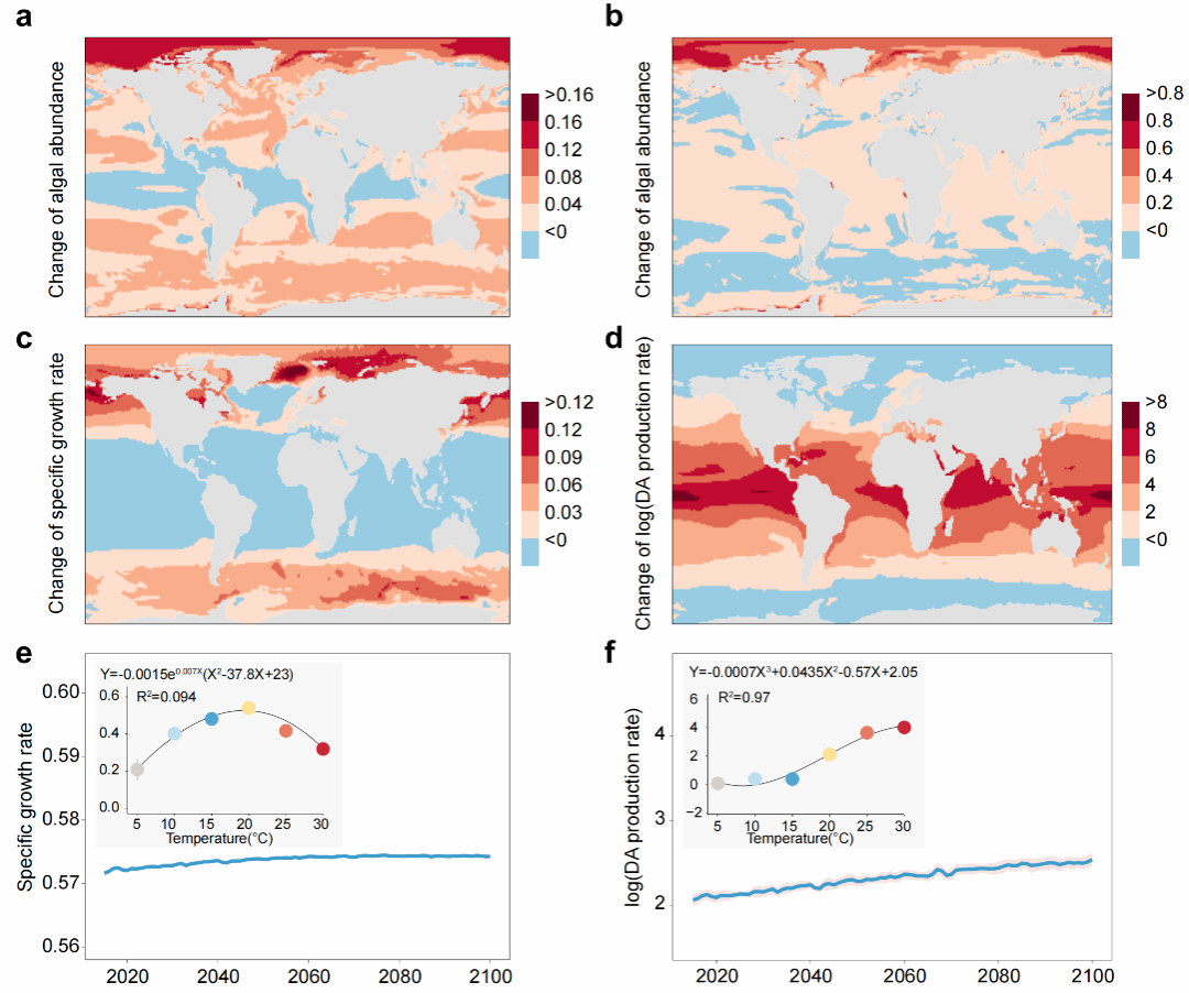基于實(shí)驗(yàn)室長(zhǎng)期培養(yǎng)數(shù)據(jù)、全球宏組學(xué)觀測(cè)及氣候環(huán)境因子,研究團(tuán)隊(duì)利用廣義加性模型(GAM)結(jié)合CMIP6 中等排放情景(SSP2-4.5)進(jìn)行預(yù)測(cè)。結(jié)果顯示,到 2100年,P. multiseries的全球豐度將較當(dāng)前增加約75.4%,其神經(jīng)毒素生產(chǎn)效率則有望飆升至現(xiàn)水平的2倍。研究提示,未來(lái)氣候變暖不僅將顯著提高有毒赤潮發(fā)生的頻率與強(qiáng)度,還可能導(dǎo)致 P. multiseries 分布向高緯度海域擴(kuò)展,同時(shí)在熱帶海域的毒素增幅尤為顯著。模型結(jié)果表明,產(chǎn)毒硅藻的空間分布及毒性演變對(duì)未來(lái)海洋生態(tài)安全和漁業(yè)資源管理構(gòu)成了重大挑戰(zhàn)。