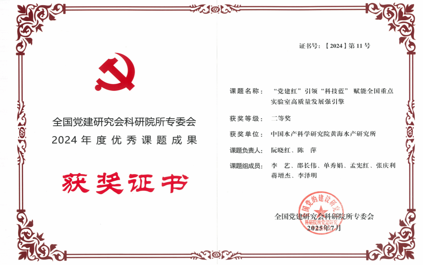 近日,全國黨建研究會科研院所專委會召開2025年全體委員會議暨課題成果交流會,評選全國黨建研究會科研院所專委會2024年度優(yōu)秀課題。中國水產(chǎn)科學研究院黃海水產(chǎn)研究所申報的《“黨建紅”引領“科技藍”賦能全國重點實驗室高質(zhì)量發(fā)展強引擎》榮獲二等獎,并入選優(yōu)秀課題成果匯編。