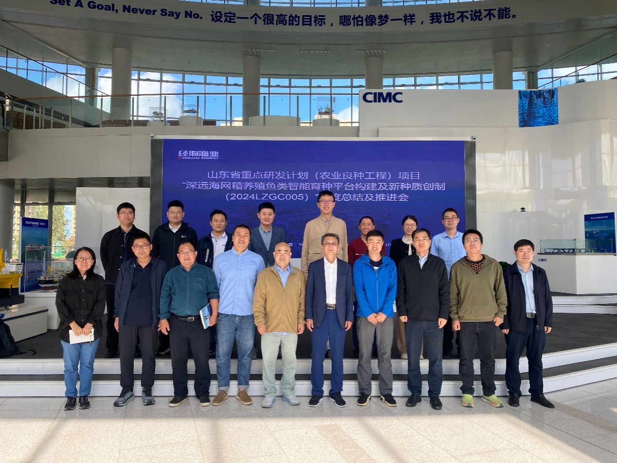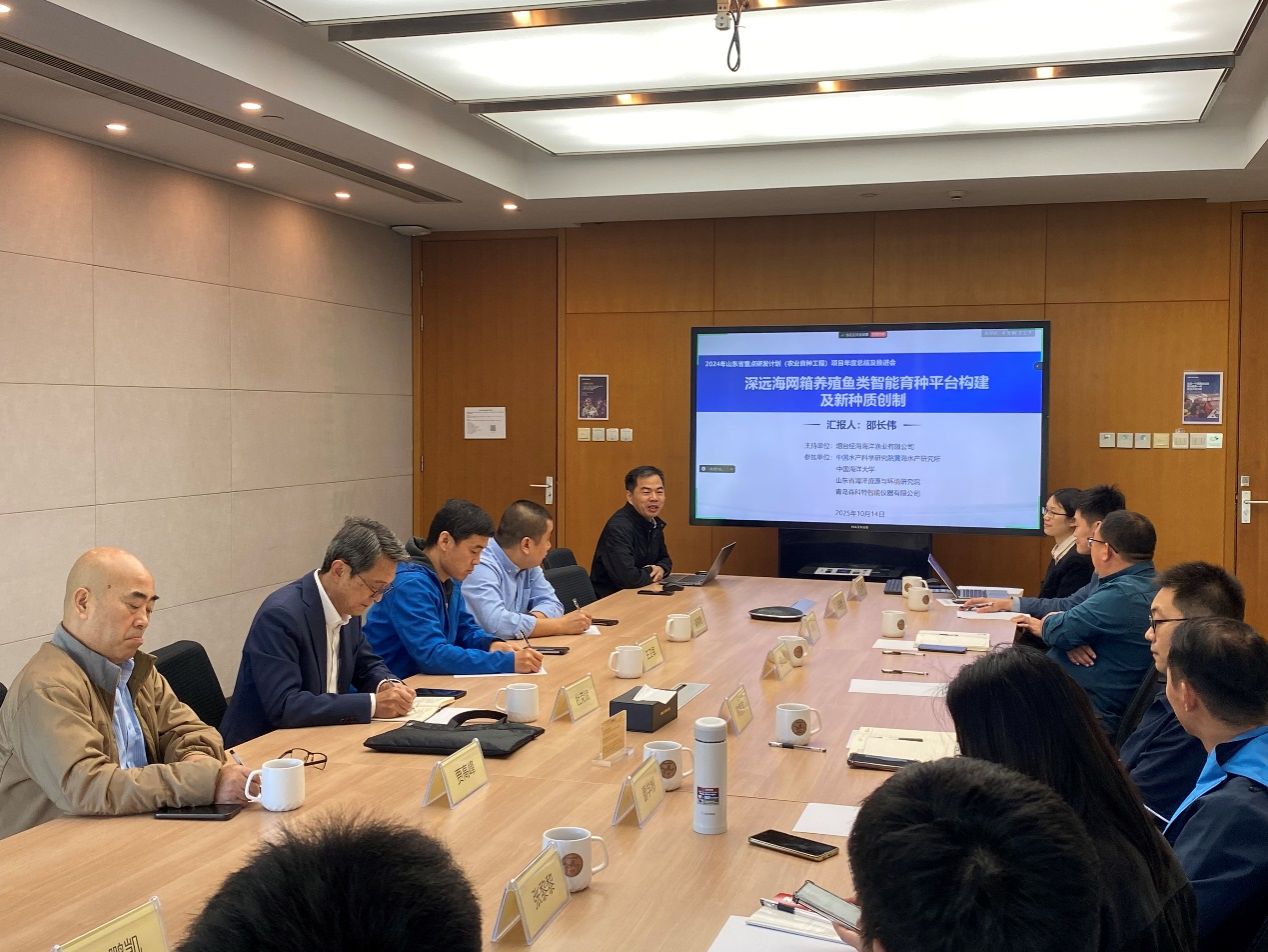 10月14日,山東省重點研發(fā)計劃(農業(yè)良種工程)“深遠海網(wǎng)箱養(yǎng)殖魚類智能育種平臺構建及新種質創(chuàng)制”項目年度總結及推進會在煙臺召開,煙臺大學杜榮斌教授、魯東大學王衛(wèi)軍教授、煙臺市海洋經(jīng)濟研究院姜黎明正高級工程師、華智生物技術與數(shù)據(jù)科學創(chuàng)新研究院執(zhí)行副院長賈高峰研究員作為項目咨詢專家組專家應邀參會,項目技術負責人中國水產科學研究院黃海水產研究所副所長邵長偉研究員、項目行政負責人煙臺經(jīng)海海洋漁業(yè)有限公司總經(jīng)理郭福元和項目組成員等10余人參會。會議由項目承擔單位負責人煙臺經(jīng)海海洋漁業(yè)有限公司科研部經(jīng)理張黎黎主持。