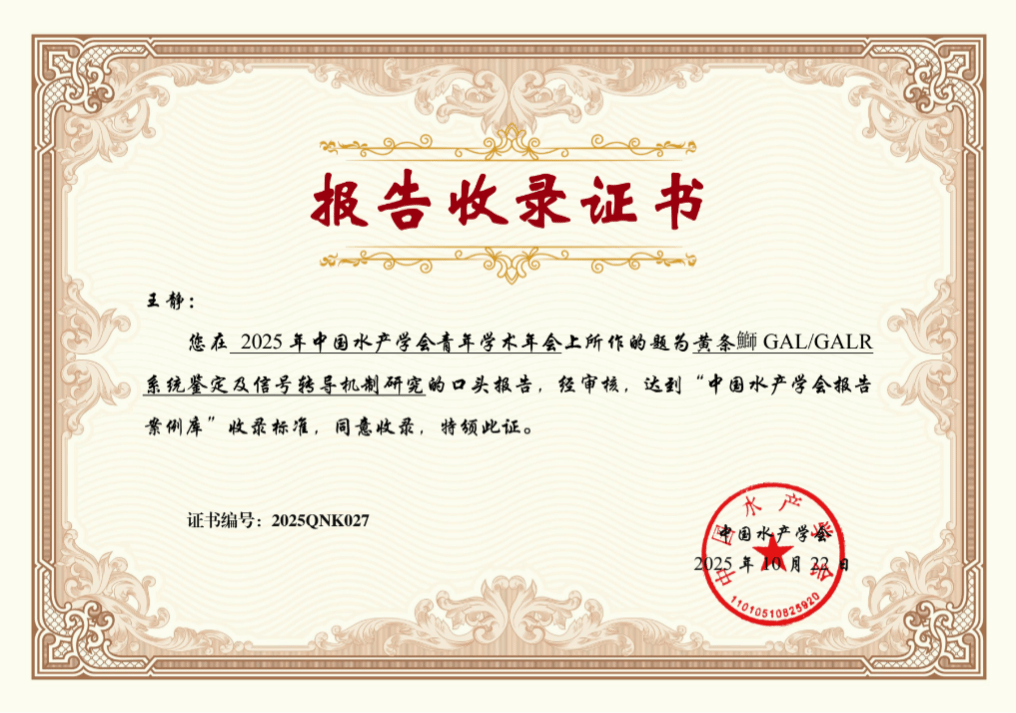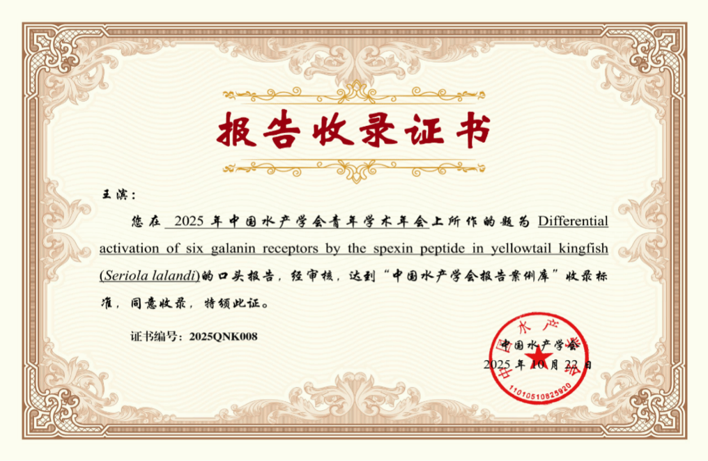 11月5日,2025中國水產(chǎn)學(xué)會(huì)范蠡學(xué)術(shù)大會(huì)在遼寧大連召開,中國水產(chǎn)科學(xué)研究院黃海水產(chǎn)研究所王濱研究員及王靜、郭慧英兩位碩士研究生在2025年中國水產(chǎn)學(xué)會(huì)青年學(xué)術(shù)年會(huì)上所作的口頭報(bào)告,經(jīng)嚴(yán)格審核,達(dá)到“中國水產(chǎn)學(xué)會(huì)報(bào)告案例庫”收錄標(biāo)準(zhǔn),被成功收錄,并獲收錄證書。