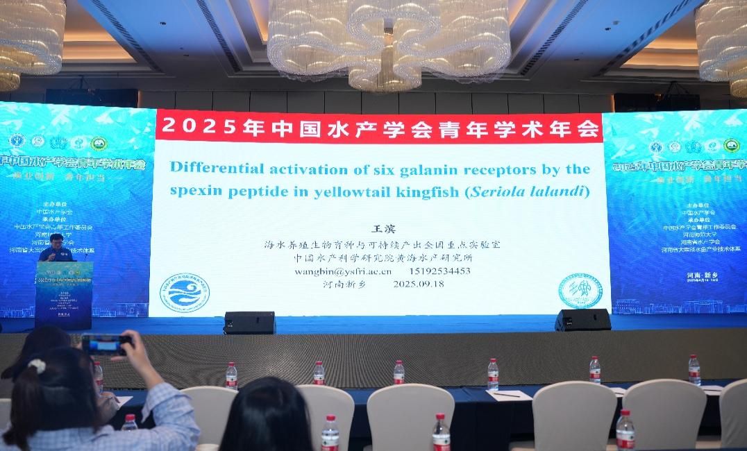 2025年中國水產(chǎn)學(xué)會(huì)青年學(xué)術(shù)年會(huì)于9月17 日至 18 日 在河南新鄉(xiāng) 舉辦 。與會(huì)期間,王濱研究員及王靜、郭慧英兩位碩士研究生分別作 了題為“Differential activation of six galanin receptors by the spexin peptide in yellowtail kingfish ( Seriola lalandi ) ” “黃條鰤GAL/GALR系統(tǒng)鑒定及信號(hào)轉(zhuǎn)導(dǎo)機(jī)制研究”“半滑舌鰨TAC3/TACR3系統(tǒng)鑒定及信號(hào)轉(zhuǎn)導(dǎo)機(jī)制研究” 的口頭報(bào)告 , 展示了黃海所在 魚類生殖生理學(xué)和魚類內(nèi)分泌學(xué) 等研究方向的最新成果,并與 國內(nèi)同行專家學(xué)者進(jìn)行了 深入探討和廣泛交流。