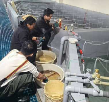 志愿服務(wù)隊(duì)在企業(yè)指導(dǎo)日本對(duì)蝦育種