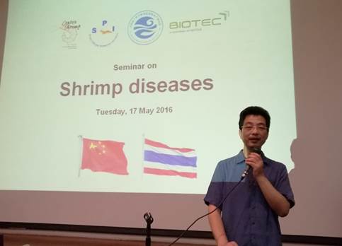 在這次學(xué)術(shù)交流活動(dòng)中,黃倢研究員介紹了中國養(yǎng)殖對蝦主要疫病流行情況及研究進(jìn)展,并宣講了養(yǎng)殖對蝦生物安保的理念及其執(zhí)行所需的主要技術(shù)要素;Kallaya Sritunyalucksana研究員介紹了目前在泰國對蝦養(yǎng)殖業(yè)危害較為嚴(yán)重的4種主要病原的研究進(jìn)展;張慶利研究員和梁艷副研究員分別介紹了新發(fā)疫病CMNV的流行及最新研究進(jìn)展及WSSV與宿主互作研究進(jìn)展;Sage Chalyapechara博士介紹了通過宏基因組學(xué)對對蝦腸道微生物菌群進(jìn)行分選鑒定。此外,黃海所科研人員還訪問了泰國國立瑪希隆大學(xué),與Timothy W. Flegel教授、Kallaya Sritunyalucksana研究員、Vanvimon Saksmerprome研究員等就多方建立聯(lián)合實(shí)驗(yàn)室、構(gòu)建海水養(yǎng)殖疫病研究協(xié)作網(wǎng)絡(luò)的具體步驟和詳細(xì)計(jì)劃進(jìn)行了深入研討,并起草了合作相關(guān)諒解備忘錄。