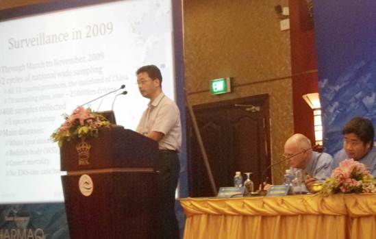會(huì)議中,黃倢研究員做了題為“Epidemiological study on farmed shrimp in China”的報(bào)告,總結(jié)了黃海所呈報(bào)給世界動(dòng)物衛(wèi)生組織(OIE)并已報(bào)道的對蝦疫病的流行病學(xué)研究進(jìn)展。黃海所科研人員還利用互聯(lián)網(wǎng),向中國水產(chǎn)科學(xué)院水產(chǎn)病害防治學(xué)科群全程呈現(xiàn)了報(bào)告和墻報(bào)的圖像,使水科院本學(xué)科人員實(shí)時(shí)了解到會(huì)議的內(nèi)容,提升了院內(nèi)本學(xué)科的學(xué)術(shù)氛圍,為全院同行及時(shí)跟蹤本學(xué)科的國際前沿動(dòng)態(tài)提供了有價(jià)值的機(jī)會(huì)。
