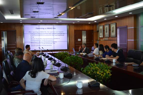 會(huì)上,李健副所長(zhǎng)對(duì)Merton Smith主任一行到訪表示歡迎,并簡(jiǎn)要介紹了中國(guó)水產(chǎn)養(yǎng)殖的現(xiàn)狀以及黃海所在機(jī)構(gòu)設(shè)置、學(xué)科方向和科研成果等方面的基本情況,并重點(diǎn)說(shuō)明了黃海所在水產(chǎn)藥理學(xué)領(lǐng)域開(kāi)展的研究和取得的進(jìn)展。Merton Smith主任介紹了美國(guó)食品藥品管理局的總體概況,并詳細(xì)闡述了獸醫(yī)中心的組織機(jī)構(gòu)、管理工作和服務(wù)范圍等內(nèi)容。.Raafat Fahmy 博士、Steve Yan博士分別就獸藥仿制藥在美國(guó)注冊(cè)流程、中美獸藥仿制藥的區(qū)別以及FDA對(duì)食品安全風(fēng)險(xiǎn)評(píng)估的內(nèi)容、評(píng)估方法、評(píng)估流程等內(nèi)容作了詳實(shí)的報(bào)告。華盛頓州高級(jí)食品顧問(wèn)Ali Kashani向大家簡(jiǎn)單介紹了包括魚(yú)飼料在內(nèi)的美國(guó)飼料管理。雙方與會(huì)人員還就感興趣的問(wèn)題進(jìn)行了深入探討與交流。