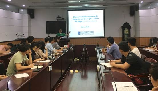 李軍博士做了題為“Effects of Cell Differentiation on the Phagocytic Activities of IgM+B cells in Nile tilapia (Oreochromis niloticus)”的學(xué)術(shù)報(bào)告,詳細(xì)介紹了羅非魚吞噬免疫過程中細(xì)胞分化作用的最新研究進(jìn)展,并建議與會(huì)人員立足于水產(chǎn)養(yǎng)殖實(shí)踐和產(chǎn)業(yè)需求開展科學(xué)研究與技術(shù)創(chuàng)新,重視水產(chǎn)生命現(xiàn)象和過程中蘊(yùn)含的重大科研命題。李軍博士的精彩報(bào)告給與會(huì)人員帶來了深刻啟發(fā),引起了他們的強(qiáng)烈興趣,并展開了熱烈討論。