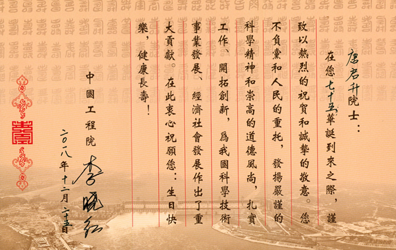 這一天,他收到了中國工程院院長李曉紅院士發(fā)來的生日賀信,“在您七十五華誕到來之際,謹(jǐn)致以熱烈的祝賀和誠摯的敬意。您不負(fù)黨和人民的重托,發(fā)揚(yáng)嚴(yán)謹(jǐn)?shù)目茖W(xué)精神和崇高的道德風(fēng)尚,扎實(shí)工作、開拓創(chuàng)新,為我國科學(xué)技術(shù)事業(yè)發(fā)展、經(jīng)濟(jì)社會(huì)發(fā)展做出了重大貢獻(xiàn),在此衷心祝愿您:生日快樂,健康長壽!”