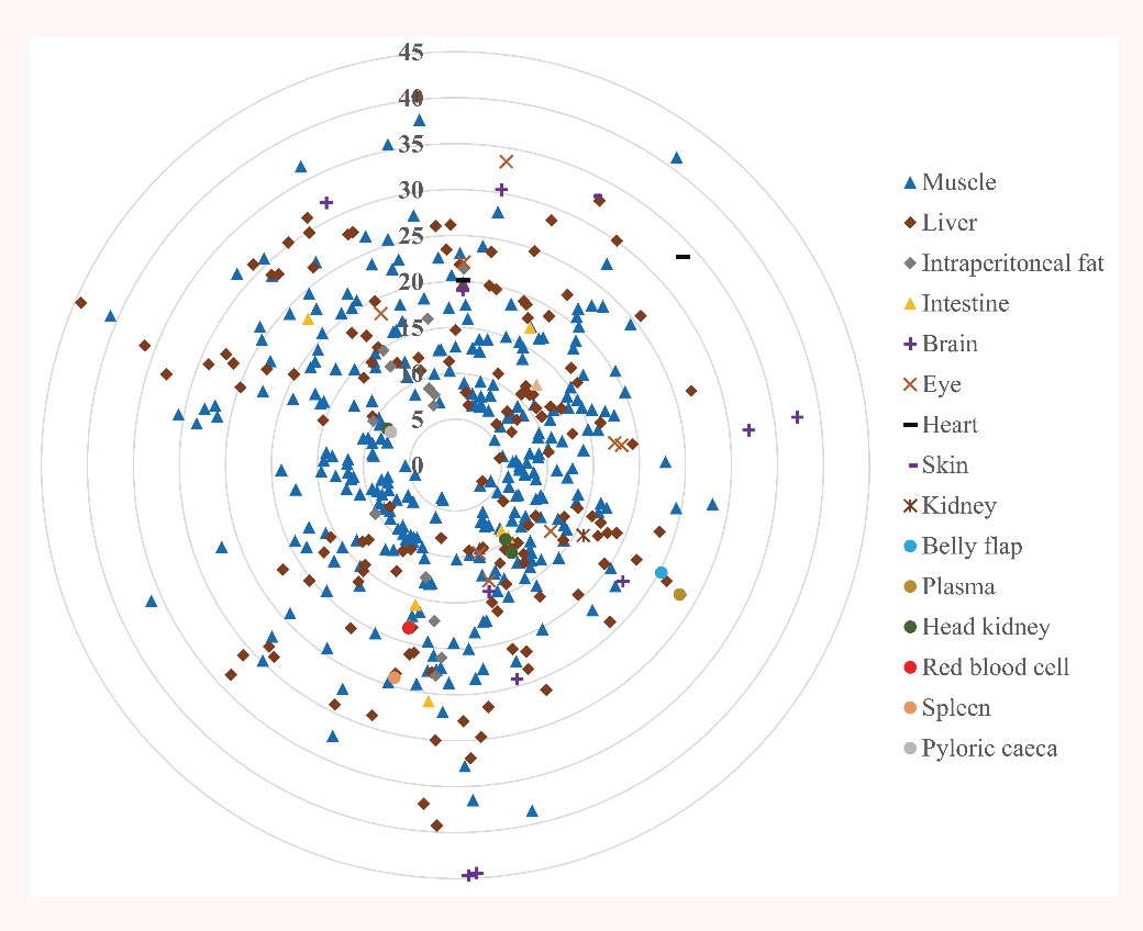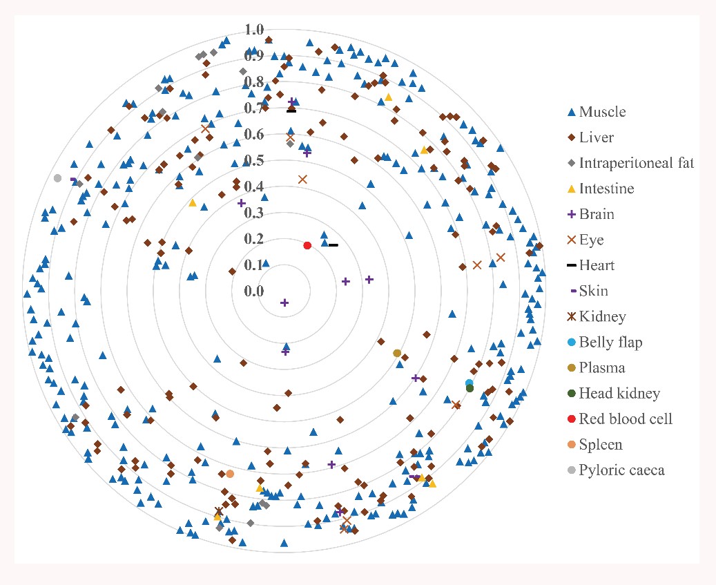 該工作在290篇涉及養(yǎng)殖魚(yú)類(lèi)飼料和魚(yú)體脂肪酸組成的代表性文獻(xiàn)基礎(chǔ)上構(gòu)建了“飼料-魚(yú)體”脂肪酸組成關(guān)系數(shù)據(jù)庫(kù)。對(duì)數(shù)據(jù)庫(kù)中脂肪酸數(shù)據(jù)進(jìn)行標(biāo)準(zhǔn)化處理后,對(duì)每篇數(shù)據(jù)中單個(gè)脂肪酸的“飼料-魚(yú)體”關(guān)系進(jìn)行了4項(xiàng)基礎(chǔ)評(píng)估參數(shù)計(jì)算:(1)Pearson雙尾相關(guān)系數(shù);(2)相對(duì)(處理間)離散度;(3)平均含量;(4)相對(duì)變化量(gain or loss%)。并且,針對(duì)每個(gè)組織構(gòu)建了兩個(gè)綜合評(píng)價(jià)參數(shù)來(lái)定量描述其脂肪酸組成同飼料脂肪酸組成的相對(duì)關(guān)系:(1)Coefficient of Distance