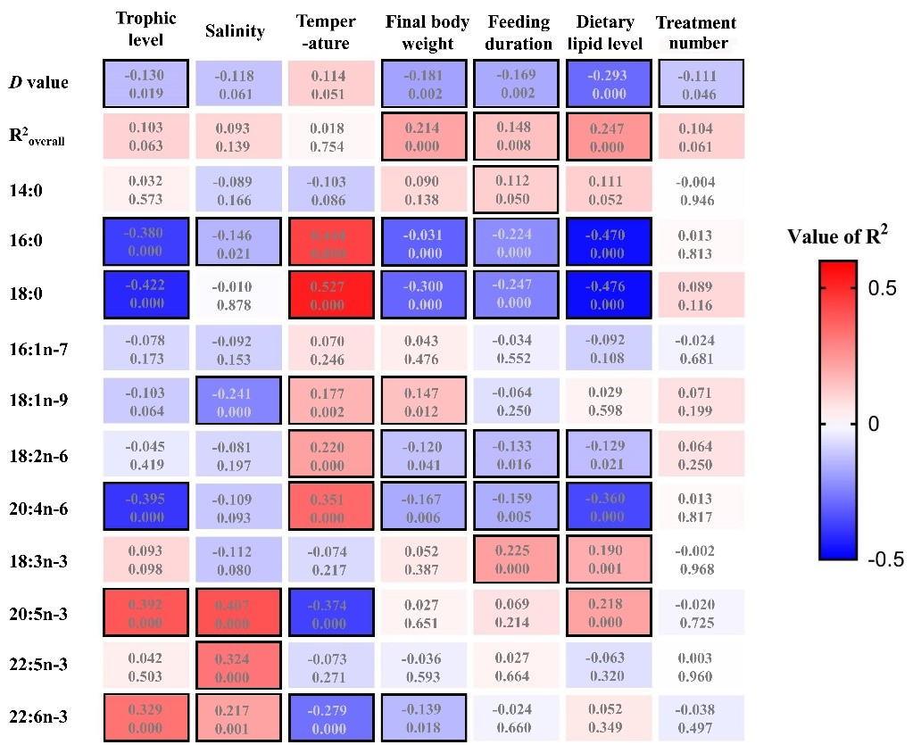 同時(shí),結(jié)合PRIMER-E生態(tài)學(xué)評(píng)估模型中的SIMPER多元相似度分析工具來(lái)分析各脂肪酸單體對(duì)飼料和組織脂肪酸組成差異度的貢獻(xiàn)值。隨后,進(jìn)一步將魚(yú)體初重、營(yíng)養(yǎng)級(jí)、投喂周期、飼料脂肪水平、養(yǎng)殖過(guò)程鹽度和溫度等環(huán)境因子的值同上述評(píng)估參數(shù)進(jìn)行了相關(guān)性分析,以實(shí)現(xiàn)對(duì)這些因素影響“飼料-魚(yú)體”脂肪酸關(guān)系的定量評(píng)估。相關(guān)分析結(jié)果以定量化方式系統(tǒng)闡述了“飼料-魚(yú)體”脂肪酸組成關(guān)系在不同脂肪酸、不同組織、不同脂質(zhì)類(lèi)型及不同養(yǎng)殖魚(yú)類(lèi)間的差異,揭示和發(fā)現(xiàn)了魚(yú)類(lèi)脂肪酸沉積過(guò)程中諸多新的特征和規(guī)律。該項(xiàng)研究工作為養(yǎng)殖魚(yú)類(lèi)脂肪酸營(yíng)養(yǎng)品質(zhì)評(píng)價(jià)提供了重要的方法學(xué)創(chuàng)新。