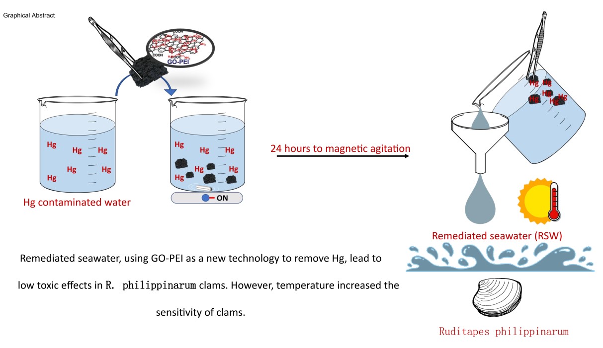 在此研究基礎(chǔ)上,該團(tuán)隊(duì)聯(lián)合葡萄牙研究團(tuán)隊(duì)研發(fā)并應(yīng)用了氧化石墨烯-聚乙烯亞胺復(fù)合納米材料(GO-PEI)用于吸附污染海水中的Hg2+。結(jié)果顯示,GO-PEI對(duì)污染海水中Hg2+具有很好的吸附效果(吸附率>90%),且經(jīng)GO-PEI修復(fù)后的海水在生化指標(biāo)及組織病理等水平上均未對(duì)菲律賓蛤仔造成顯著影響,確認(rèn)了GO-PEI作為海水污染物高效吸附材料的安全性。