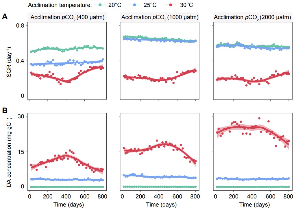 圖2. 海洋升溫和酸化對(duì)多列擬菱形藻生長(zhǎng)和軟骨藻酸代謝的影響