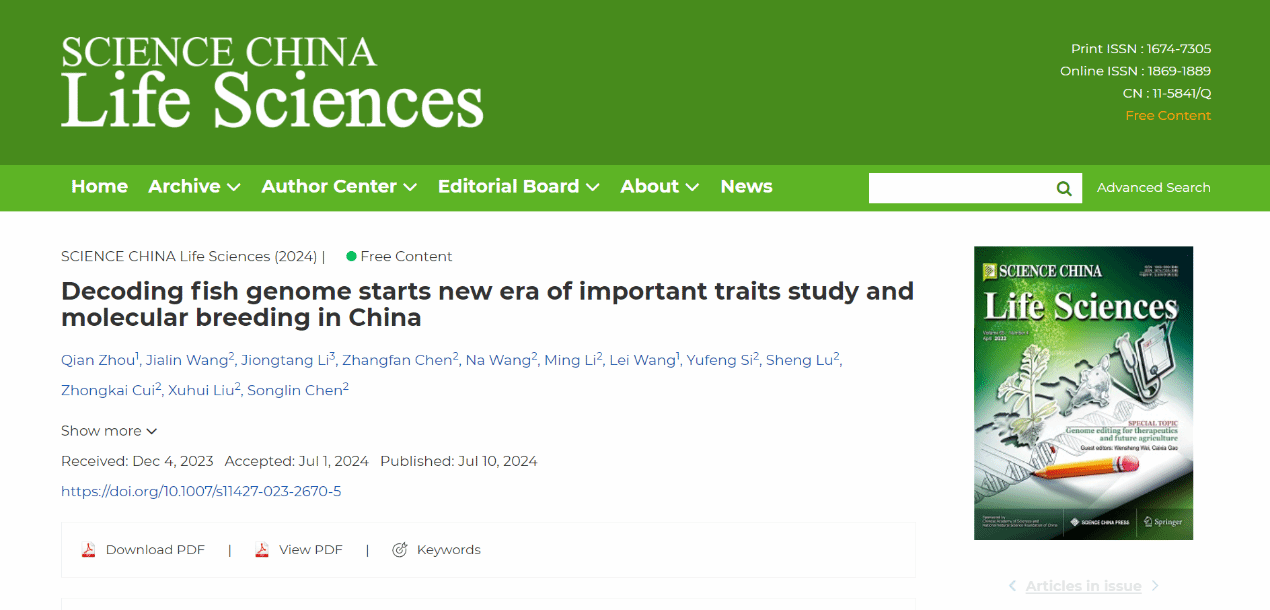 近日,Science China Life Sciences雜志在線發(fā)表了中國水產(chǎn)科學(xué)研究院黃海水產(chǎn)研究所陳松林院士團隊題為“Decoding fish genome starts new era of important traits study and molecular breeding in China”的綜述。該綜述總結(jié)了中國在魚類基因組研究和分子育種領(lǐng)域取得的重要進展,并對未來的研究方向進行了展望和探討。