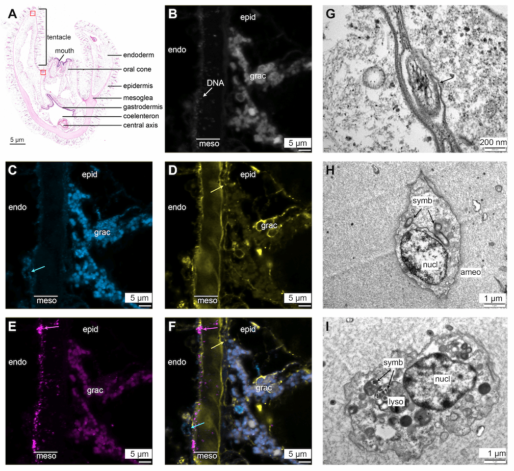 與磷蝦腸道菌群的高多樣性不同,深海黑珊瑚的共生菌群呈現(xiàn)出精簡而穩(wěn)定的特征。通過多地點(diǎn)、多深度樣本證實(shí)其體內(nèi)主要由三大類共生菌主導(dǎo),主要集中于水螅體的中膠層,形成一個高度特化的內(nèi)部微生態(tài)系統(tǒng)。這種簡化模式暗示著宿主通過長期協(xié)同進(jìn)化,主動篩選并維系了一個功能互補(bǔ)、效率極高的核心共生群體。此外,研究提出了宿主-共生菌穩(wěn)態(tài)調(diào)控分子模型,即宿主通過免疫反應(yīng)、吞噬與溶酶體消化等機(jī)制,有效維持與共生菌的平衡,實(shí)現(xiàn)長期穩(wěn)定共存(Cell Host & Microbe,2025)。