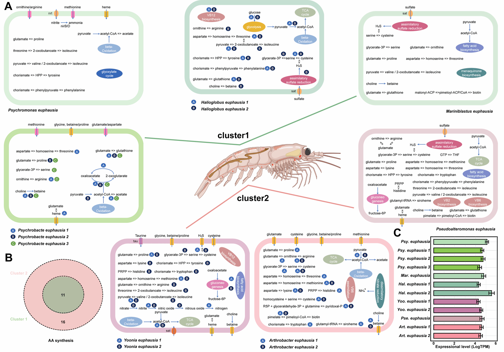 除了自身基因組創(chuàng)新,南極磷蝦還通過與腸道共生菌建立高效的協(xié)同關(guān)系適應(yīng)極端的環(huán)境。團(tuán)隊(duì)首次系統(tǒng)解析了南極磷蝦腸道菌群的功能,鑒定出12個高豐度的新菌群,根據(jù)代謝潛能將它們分為兩大功能簇,分別參與宿主降解有機(jī)物過程和合成宿主所需多種氨基酸、維生素。轉(zhuǎn)錄組數(shù)據(jù)證實(shí)腸道共生菌代謝活躍,它們?nèi)缤粋€內(nèi)置的、可動態(tài)調(diào)控的營養(yǎng)補(bǔ)給站和抗氧化劑合成工廠,極大地增強(qiáng)了南極磷蝦在營養(yǎng)波動和氧化應(yīng)激環(huán)境中的生存韌性(mSystems,2025)。