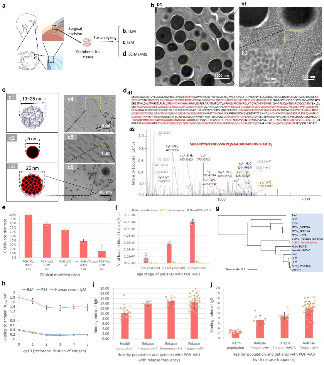 研究團(tuán)隊(duì)聚焦于臨床一種新發(fā)、病因不明的“持續(xù)性高眼壓病毒性前葡萄膜炎(POH-VAU)”,其臨床表現(xiàn)為反復(fù)發(fā)作的輕度前葡萄膜炎、藥物難以控制的持續(xù)性高眼壓(部分患者眼壓逾50 mmHg)、角膜后少量沉著物(KPs)及視神經(jīng)損傷。此前由于常規(guī)療法效果不佳,其病因始終未能查明。研究人員利用透射電鏡、免疫電鏡及高靈敏技術(shù)(LC-MS/MS和qPCR),在患者手術(shù)切除的虹膜組織中成功鑒定到了CMNV病毒顆粒及其特異性蛋白序列,與已知CMNV蛋白序列同源性高達(dá)98.96%。隨后的血清學(xué)研究進(jìn)一步揭示,在受訪的70名確診患者血液中,均檢測(cè)到CMNV特異性IgM和IgG抗體轉(zhuǎn)化;且患者體內(nèi)病毒載量與其眼壓水平呈顯著正相關(guān)。這一系列發(fā)現(xiàn)從病原學(xué)和免疫學(xué)角度證實(shí)了CMNV感染與該新型眼病直接關(guān)聯(lián)。