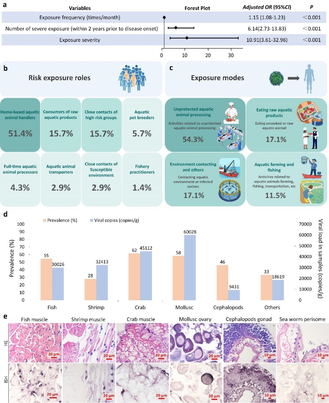 為探究病毒的傳播途徑,研究團(tuán)隊(duì)深入開(kāi)展了流行病學(xué)調(diào)查、病例對(duì)照研究及回歸模型分析。結(jié)果顯示,“無(wú)防護(hù)處理水產(chǎn)動(dòng)物”(如在宰殺、清洗過(guò)程中被刺傷)和“生食水產(chǎn)品”是兩大主要暴露途徑,占到調(diào)查病例的71.4%。調(diào)查還發(fā)現(xiàn),伴有皮膚破損的嚴(yán)重暴露是導(dǎo)致發(fā)病的獨(dú)立危險(xiǎn)因素。研究進(jìn)一步揭示,在高風(fēng)險(xiǎn)暴露后,該病的潛伏期通常在3個(gè)月以內(nèi),且感染后的病情往往更加嚴(yán)重。