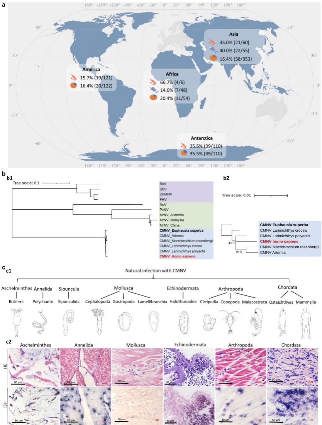 此外,全球范圍的分子流行病學(xué)調(diào)查揭示出,CMNV病毒在亞洲、美洲、歐洲、非洲及南極洲的養(yǎng)殖和野生水生動(dòng)物體內(nèi)廣泛存在。在南極磷蝦樣本中,該病毒的陽(yáng)性率高達(dá)35.5%,其宿主范圍橫跨了甲殼亞門(mén)和脊椎動(dòng)物亞門(mén)等10個(gè)動(dòng)物亞門(mén)。系統(tǒng)發(fā)育分析顯示,從南極磷蝦中分離的CMNV毒株處于進(jìn)化樹(shù)的基部(根部)。結(jié)合極高的流行率,研究團(tuán)隊(duì)推測(cè),南極磷蝦極可能是CMNV的原始自然宿主。這預(yù)示著該病毒在海洋生態(tài)系統(tǒng)中擁有古老的進(jìn)化歷史,并具備廣泛的宿主適應(yīng)性。