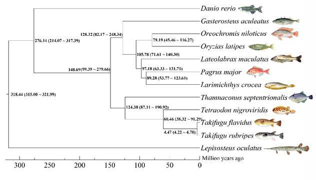 FIGURE 2 Phylogenetic analysis of the filefish with other teleost species. Lepisosteus oculatus was used as the outgroup.