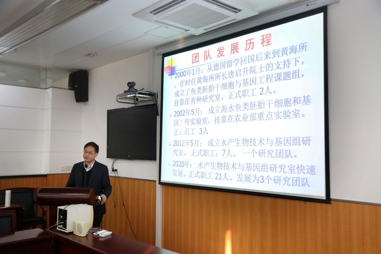 基因組室主任陳松林研究員感謝歷屆所領導班子對基因組室工作的關心與支持,并回顧了研究室科研團隊從無到有、從弱到強的發(fā)展歷程,總結了團隊建設和學科發(fā)展現(xiàn)狀以及取得的豐碩成果。李健副所長充分肯定了基因組室取得的成績,提出今后要更加重視漁業(yè)科技領域原始創(chuàng)新、技術成果應用轉化、青年科研人才培養(yǎng)以及加強與畜牧領域合作等建議。