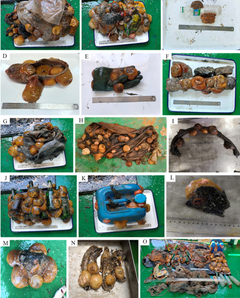 圖1. 須毛高齡細(xì)指???Metridium senile fimbriatum) 在不同類型海底垃圾上附著