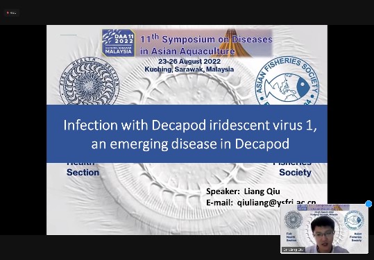 受新冠肺炎疫情影響,第11屆亞洲水產(chǎn)養(yǎng)殖魚病研討會(huì)(DAA11)推遲舉辦,F(xiàn)HS-AFS通過組織網(wǎng)絡(luò)研討會(huì)來加強(qiáng)各國(guó)學(xué)者和養(yǎng)殖從業(yè)者的學(xué)術(shù)交流和聯(lián)系,本次會(huì)議的主題是“水生動(dòng)物病毒性疾病”。邱亮博士作了題為“Infection with Decapod iridescent virus 1”的特邀報(bào)告,介紹了十足目虹彩病毒病分子流行病學(xué)最新研究進(jìn)展,報(bào)告引起與會(huì)者的廣泛關(guān)注和熱烈討論。
