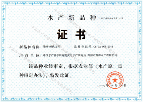 “鲆優(yōu)2號”牙鲆新品種是黃海水產(chǎn)研究所聯(lián)合海陽市黃海水產(chǎn)有限公司歷經(jīng)10余年培育出的抗病高產(chǎn)新品種,也是我國采用全基因組選擇技術(shù)結(jié)合家系選育技術(shù)培育出的一個魚類高產(chǎn)抗病新品種。該新品種具有生長快、養(yǎng)殖成活率高的優(yōu)點(diǎn)。經(jīng)養(yǎng)殖對比,比普通牙鲆生長速度提高20%,養(yǎng)殖成活率提高20%。該新品種于2017年獲得國家水產(chǎn)新品種證書。2018年10月專家組在海陽市黃海水產(chǎn)有限公司曾對“鲆優(yōu)2號”的養(yǎng)殖結(jié)果進(jìn)行過現(xiàn)場驗(yàn)收,“鲆優(yōu)2號”牙鲆新品種受精卵經(jīng)過18個月的育苗和養(yǎng)殖后平均體重達(dá)到1005g;2018年4月在海陽市黃海水產(chǎn)有限公司繁育的“鲆優(yōu)2號”魚卵,經(jīng)18個月的育苗和養(yǎng)殖,2019年10月份也生長到1000g左右。產(chǎn)業(yè)化推廣示范結(jié)果充分證明牙鲆“鲆優(yōu)2號”新品種的生長優(yōu)勢明顯。此外,“鲆優(yōu)2號”牙鲆成魚還表現(xiàn)出體色呈金黃色的表型,被日照養(yǎng)殖企業(yè)家稱為“黃金鲆”,市場前景廣闊。