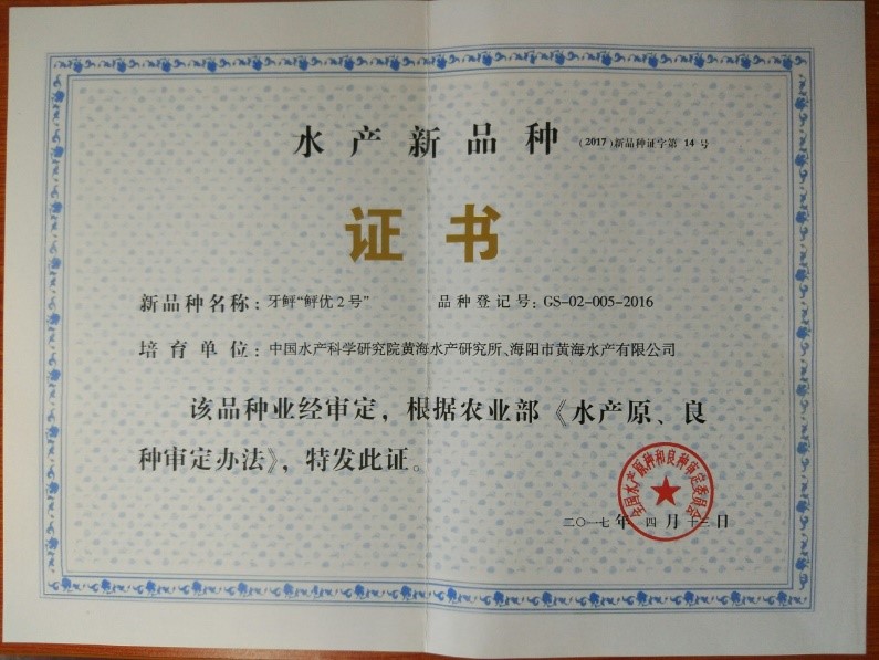 “鲆優(yōu)2號(hào)”牙鲆新品種是黃海水產(chǎn)研究所聯(lián)合海陽市黃海水產(chǎn)有限公司歷經(jīng)10余年培育出的抗病高產(chǎn)新品種,也是我國采用全基因組選擇技術(shù)結(jié)合家系選育技術(shù)培育出的一個(gè)魚類高產(chǎn)抗病新品種。該新品種具有生長快、養(yǎng)殖成活率高的優(yōu)點(diǎn)。經(jīng)養(yǎng)殖對比,比普通牙鲆生長速度提高20%,養(yǎng)殖成活率提高20%。該新品種于2017年獲得國家水產(chǎn)新品種證書。2021年3月的“鲆優(yōu)2號(hào)”受精卵,經(jīng)過育苗和10個(gè)月的養(yǎng)殖,至2022年5月20日,平均長到750克,最大個(gè)體達(dá)到900克,充分證明“鲆優(yōu)2號(hào)”牙鲆新品種優(yōu)勢明顯。