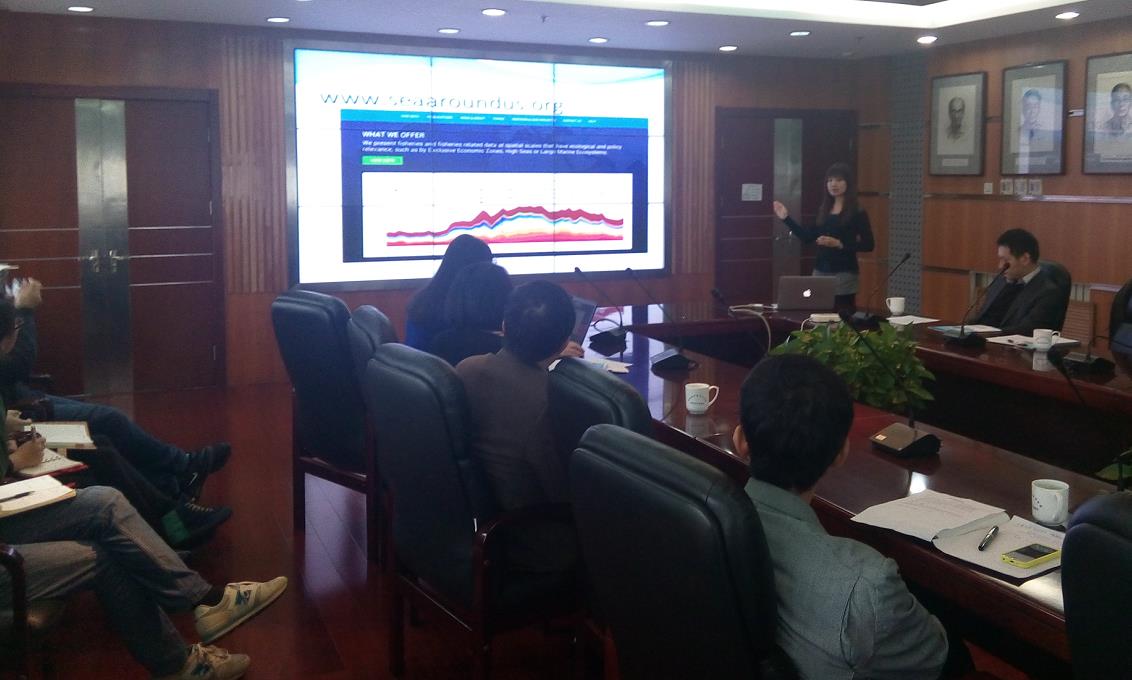 會上,單秀娟博士介紹了漁業(yè)資源與生態(tài)系統(tǒng)實驗室概況及與William Cheung博士合作的973項目進展情況,就近海漁業(yè)資源對氣候變化的響應進行了交流和研討,及確定了下一步的工作計劃。William Cheung博士作了題為“Marine fisheries and biodiversity under global change”的報告,介紹了氣候變化背景下全球漁業(yè)資源和生物多樣性的演變趨勢。Vicky Lam博士作了題為“Reconstructing the marine fisheries catch of countries: the