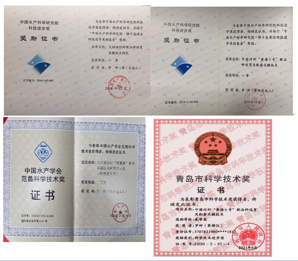 羅坤副研究員主要從事水產(chǎn)動(dòng)物遺傳育種和健康養(yǎng)殖研究。作為核心力量研發(fā)并建立了水產(chǎn)多性狀復(fù)合育種技術(shù)體系,先后開展了中國(guó)對(duì)蝦、羅氏沼蝦、凡納濱對(duì)蝦和俄羅斯鱘的遺傳選育、工藝技術(shù)體系的研究。主持國(guó)家及省市級(jí)科研項(xiàng)目15項(xiàng),發(fā)表論文90余篇、參編專著2部,獲國(guó)家發(fā)明專利13項(xiàng)、行業(yè)標(biāo)準(zhǔn)1項(xiàng)、地方標(biāo)準(zhǔn)6項(xiàng),參與選育國(guó)家級(jí)新品種4個(gè)。獲省部級(jí)一等獎(jiǎng)3次、國(guó)家海洋局海洋創(chuàng)新成果一等獎(jiǎng)1次、中國(guó)水產(chǎn)科學(xué)研究院科技進(jìn)步一等獎(jiǎng)2次、中國(guó)水產(chǎn)學(xué)會(huì)范蠡科學(xué)技術(shù)獎(jiǎng)科技進(jìn)步一等獎(jiǎng)1次、中國(guó)產(chǎn)學(xué)研合作創(chuàng)新成果二等獎(jiǎng)1次、青島市科技進(jìn)步二等獎(jiǎng)1次。